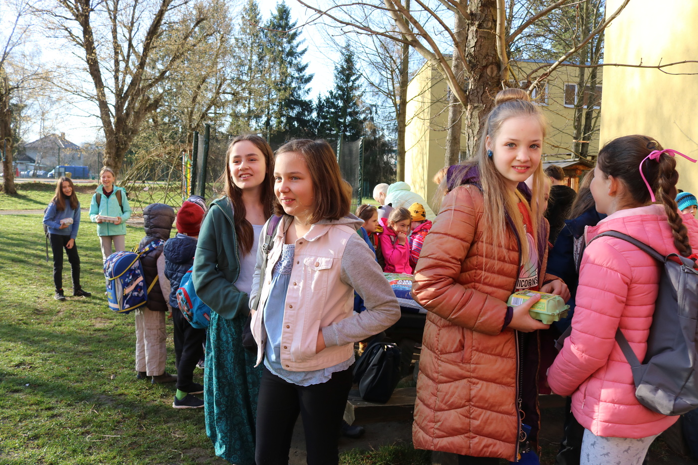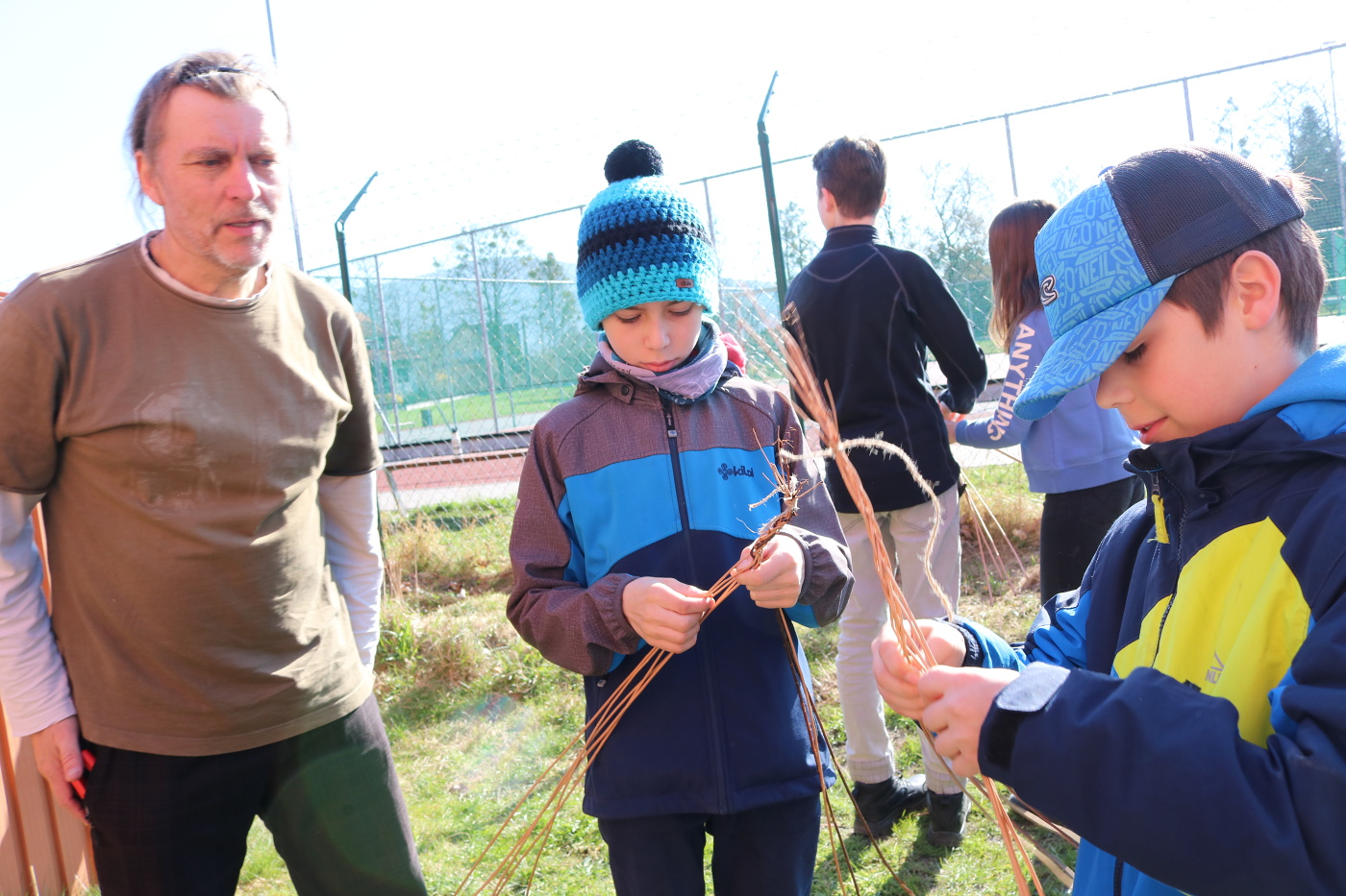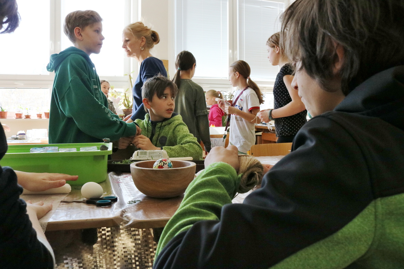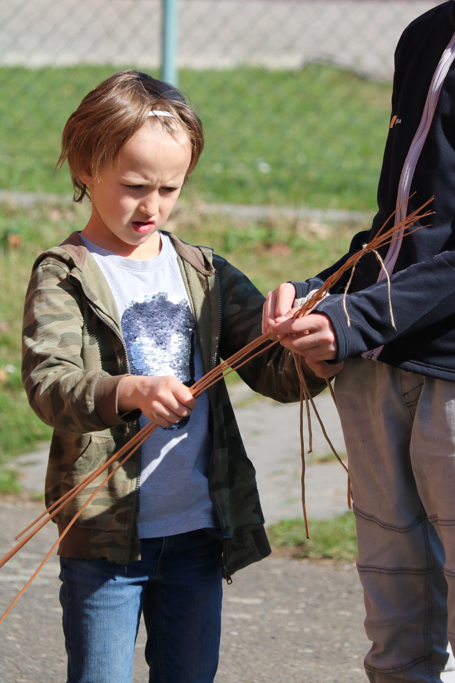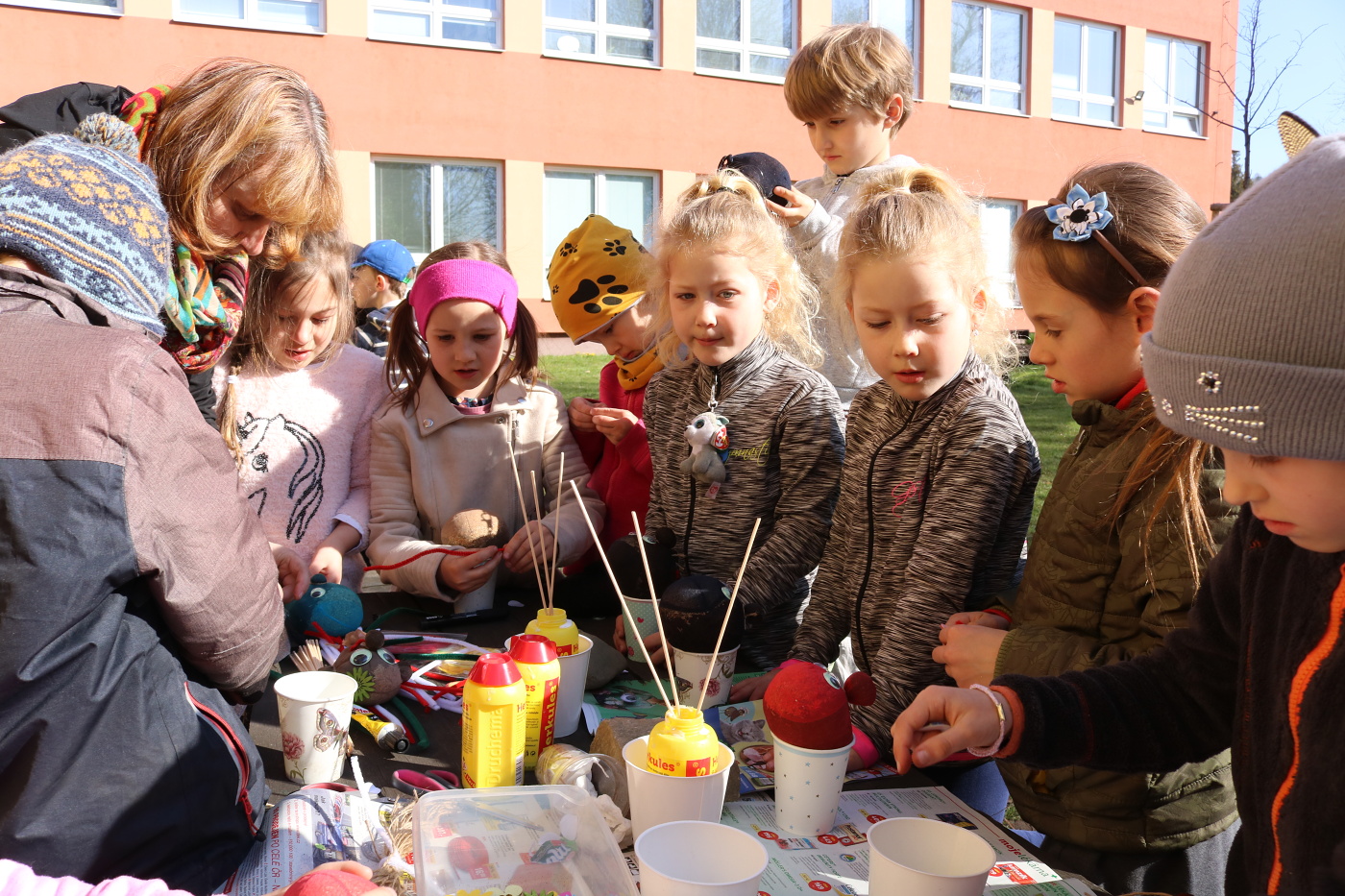 Do školy jsme se my, žáci prvního stupně, vydali tentokrát bez učebnic, vyzbrojeni jsme byli naopak vajíčky natvrdo, vajíčky syrovými, kapesním nožíkem. Sešli jsme se na zahradě, kde nás uvítali velikonoční kuřátko, zajíček a přes telefon i beránek. Pak už jsme se přesouvali od jednoho stanoviště ke druhému a na každém nám něco vzniklo. Barvili jsme a zdobili vajíčka, kuchtili jsme jarní pokrmy a pomazánky, vyrobili jsme si veselou hlavu s vlasy z trávy a s pomocí ochotných osmáků jsme si upletli z proutí tatar. Někteří se navíc stihli naučit i nové šmigrustovací říkadlo. Velikonoce můžou začít, jsme na ně připravení!