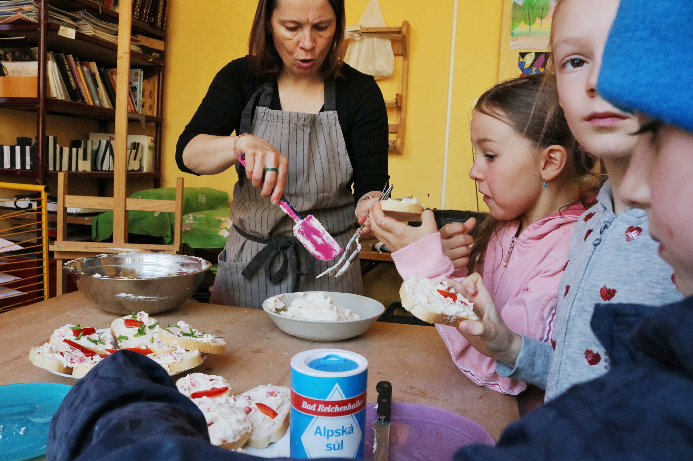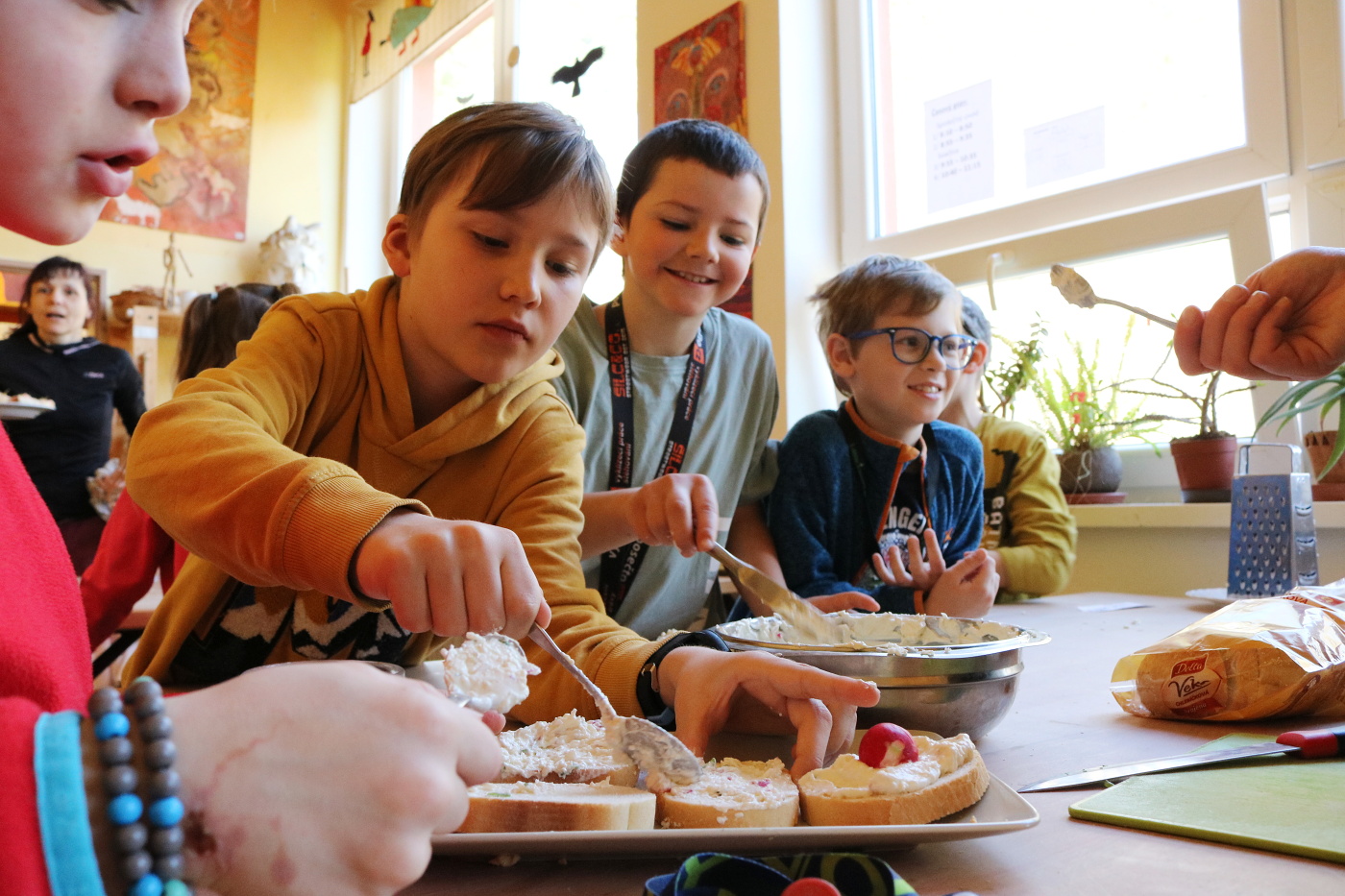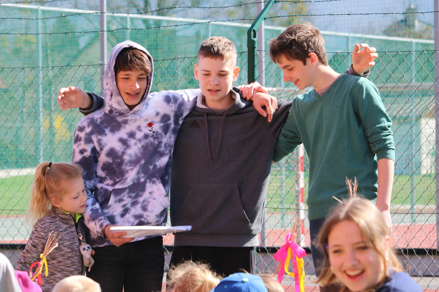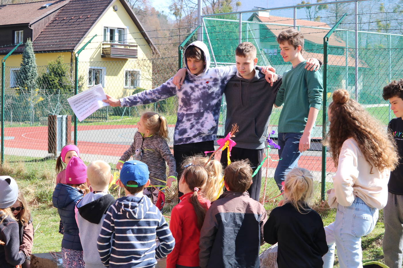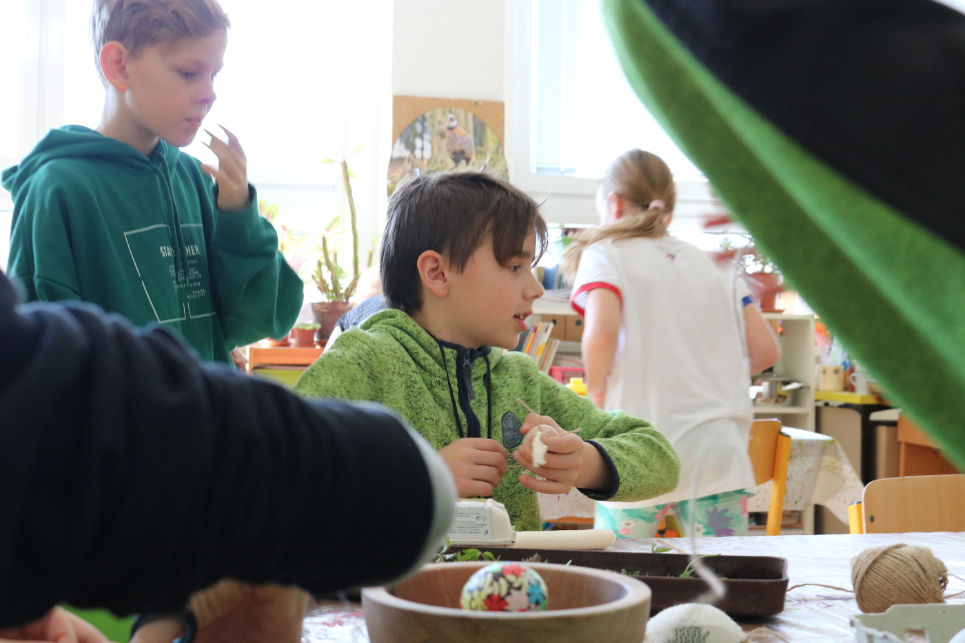 Do školy jsme se my, žáci prvního stupně, vydali tentokrát bez učebnic, vyzbrojeni jsme byli naopak vajíčky natvrdo, vajíčky syrovými, kapesním nožíkem. Sešli jsme se na zahradě, kde nás uvítali velikonoční kuřátko, zajíček a přes telefon i beránek. Pak už jsme se přesouvali od jednoho stanoviště ke druhému a na každém nám něco vzniklo. Barvili jsme a zdobili vajíčka, kuchtili jsme jarní pokrmy a pomazánky, vyrobili jsme si veselou hlavu s vlasy z trávy a s pomocí ochotných osmáků jsme si upletli z proutí tatar. Někteří se navíc stihli naučit i nové šmigrustovací říkadlo. Velikonoce můžou začít, jsme na ně připravení!