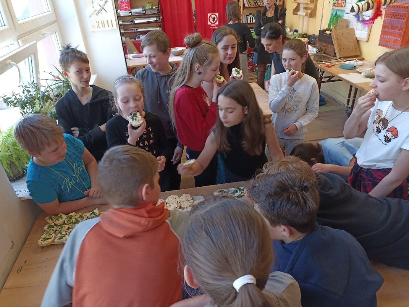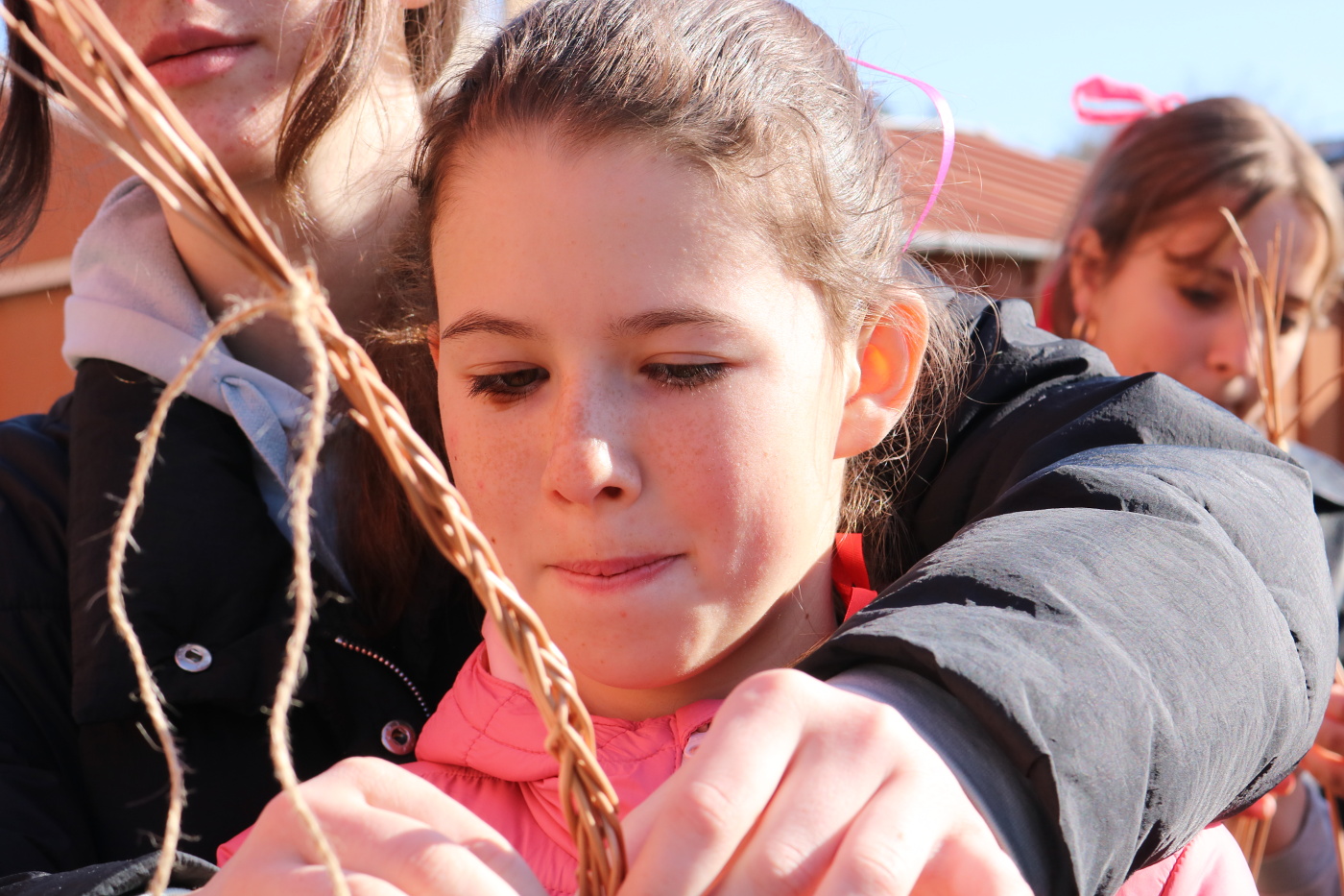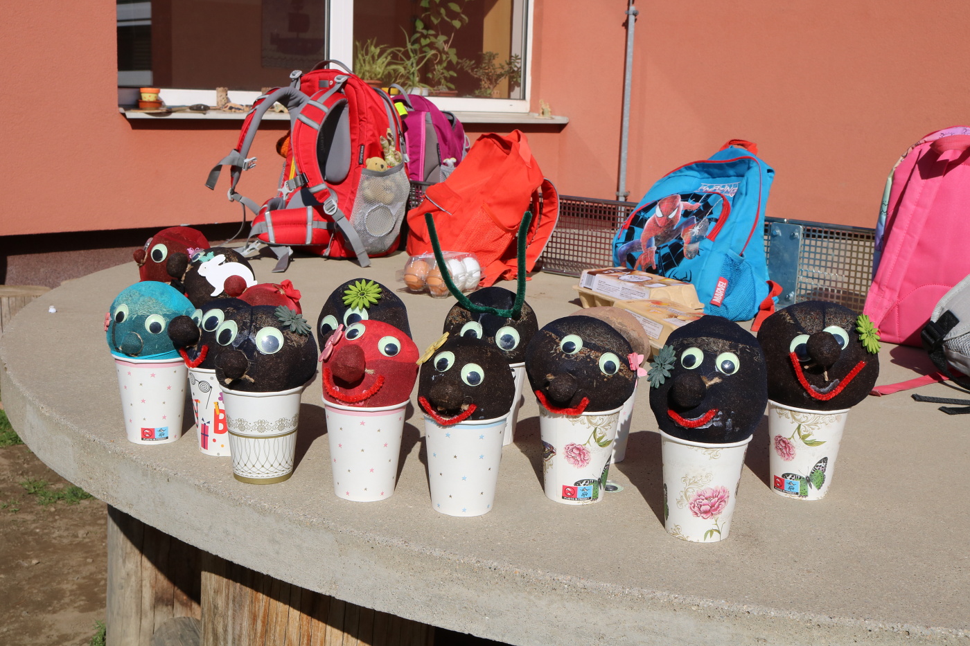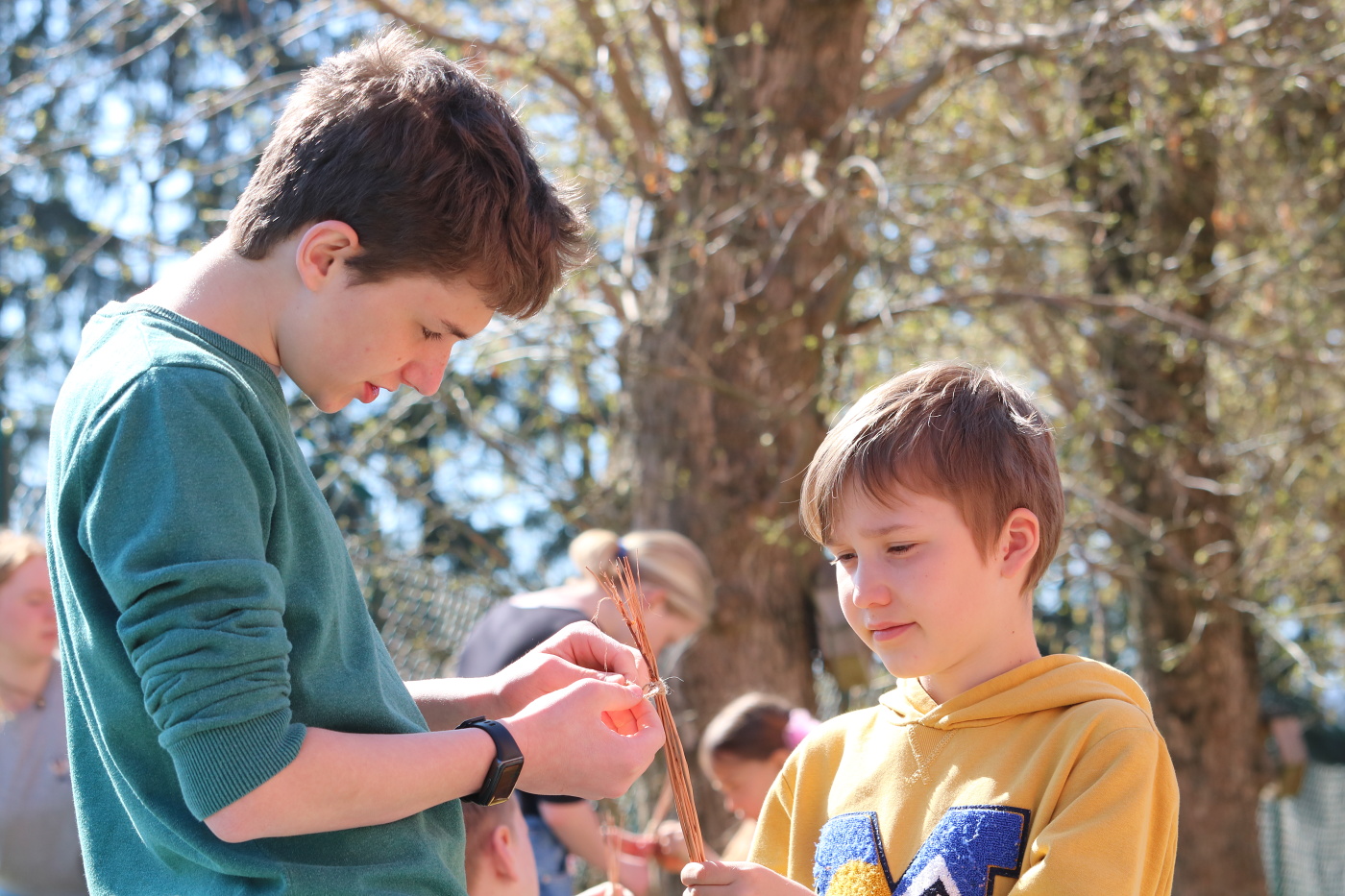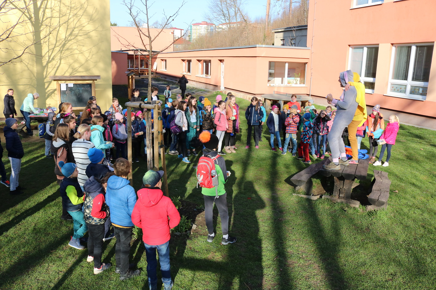 Do školy jsme se my, žáci prvního stupně, vydali tentokrát bez učebnic, vyzbrojeni jsme byli naopak vajíčky natvrdo, vajíčky syrovými, kapesním nožíkem. Sešli jsme se na zahradě, kde nás uvítali velikonoční kuřátko, zajíček a přes telefon i beránek. Pak už jsme se přesouvali od jednoho stanoviště ke druhému a na každém nám něco vzniklo. Barvili jsme a zdobili vajíčka, kuchtili jsme jarní pokrmy a pomazánky, vyrobili jsme si veselou hlavu s vlasy z trávy a s pomocí ochotných osmáků jsme si upletli z proutí tatar. Někteří se navíc stihli naučit i nové šmigrustovací říkadlo. Velikonoce můžou začít, jsme na ně připravení!