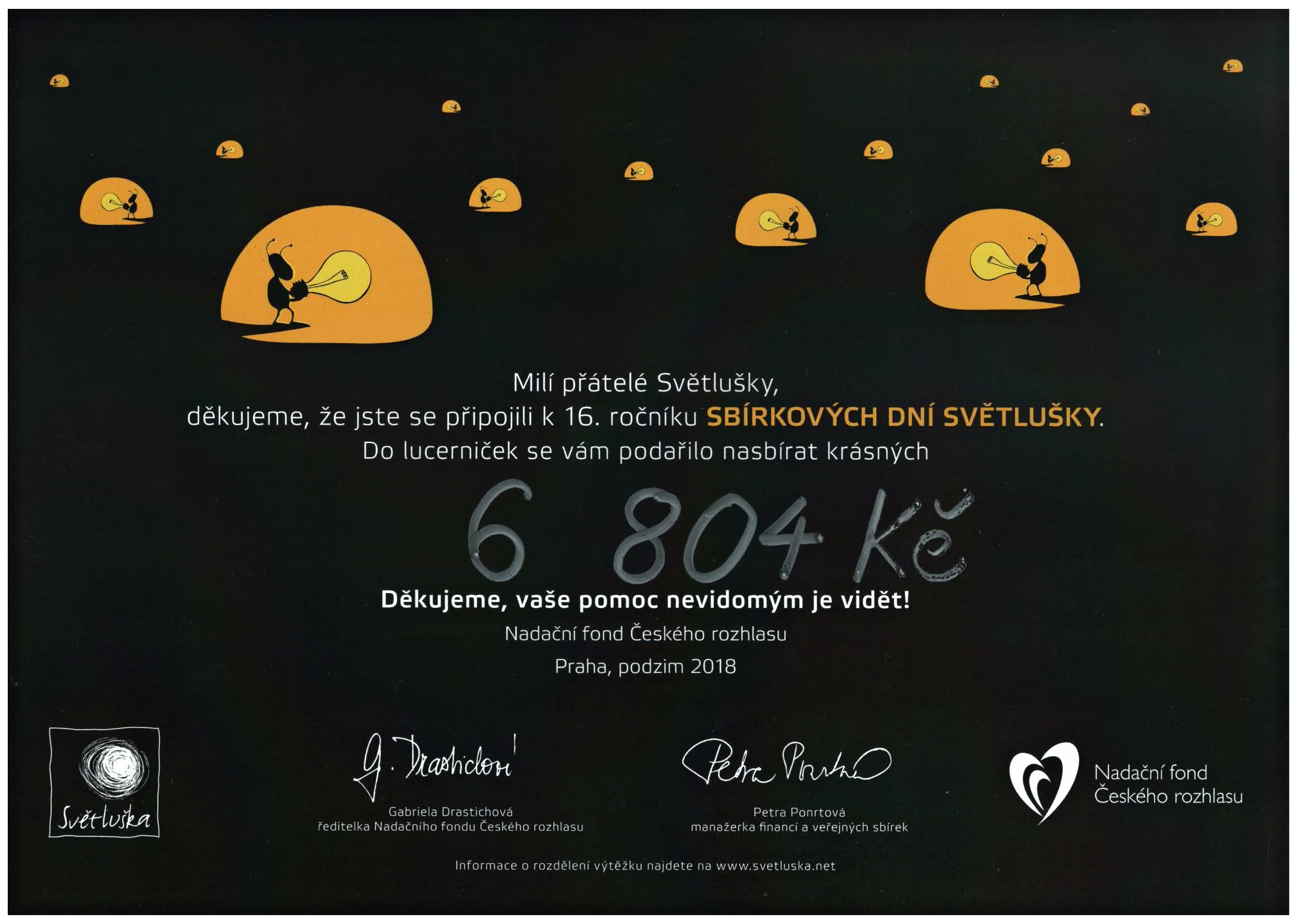 Děkujeme vám všem, kteří jste podpořili sbírkové dny Světlušky v září roku 2020. S pomocí žáků 9. třídy se na Sedmikrásce podařilo vybrat na dobrou věc 3 597 Kč.