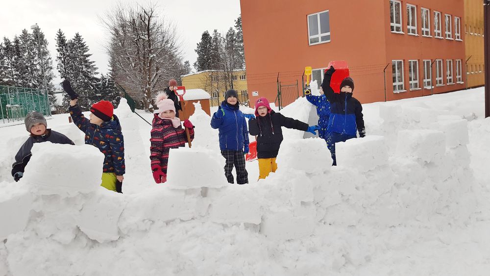 Letošní zima přeje zimním radovánkám, a tak si jich v družině užíváme plnými doušky. Stavíme, dolujeme, koulujeme se a jezdíme na lopatách. Společnými silami jsme vybudovali obří pevnost, kterou nám bohužel sluníčko roztopilo,